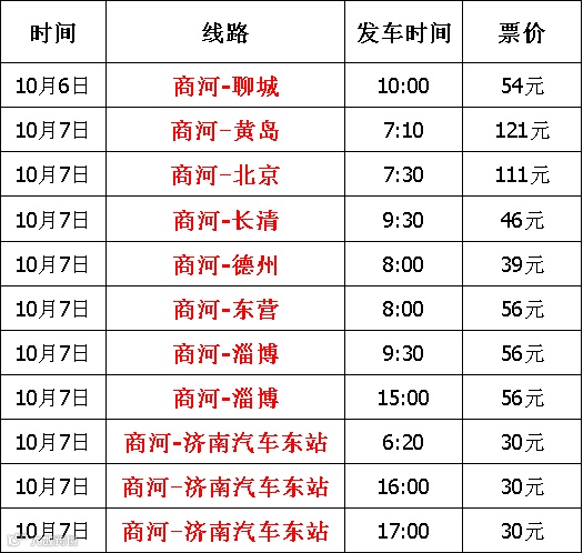 “十一”假期为解决旅客乘车需求,以下线路临时开通加班车: