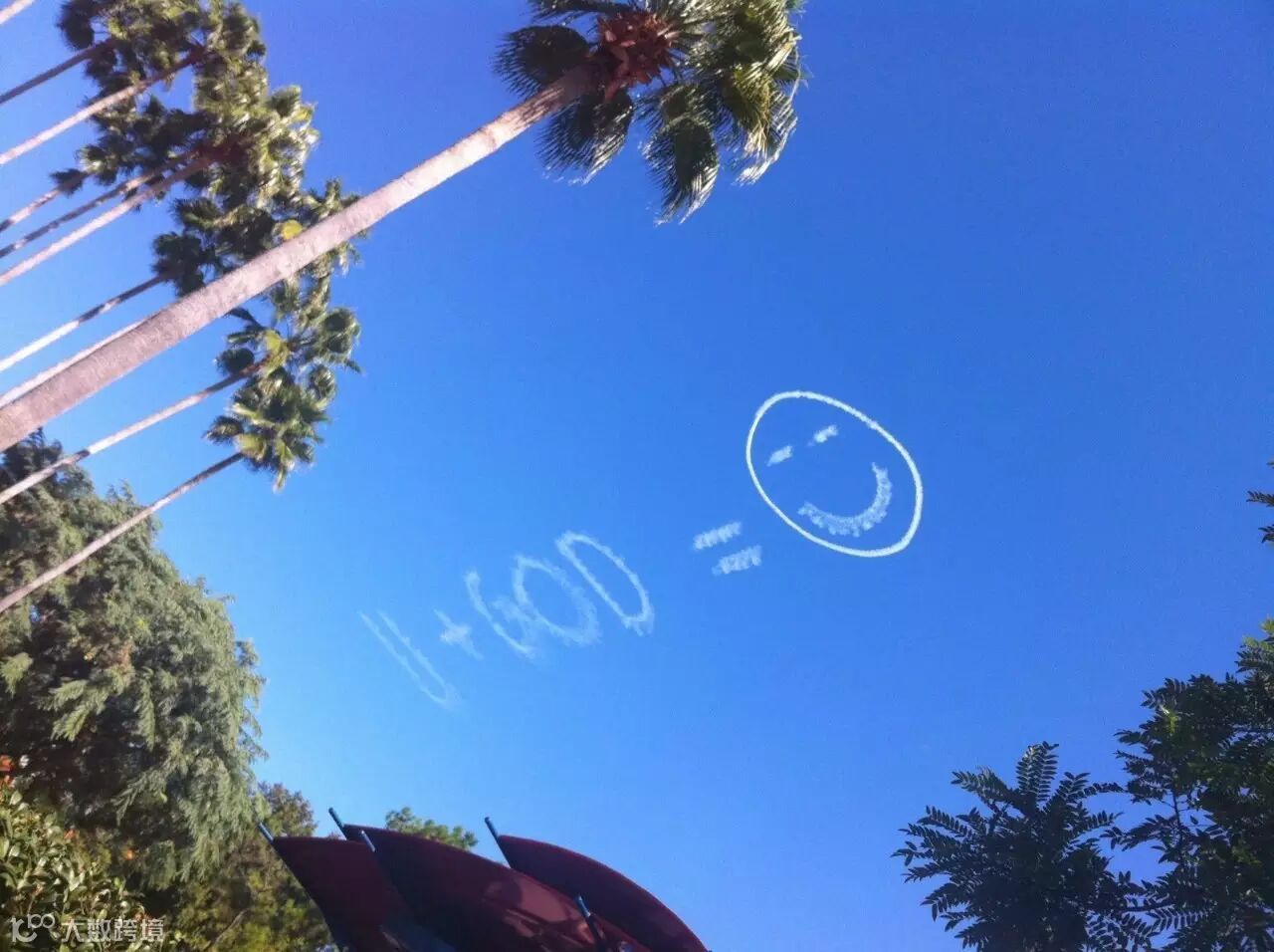 2011年的美国奥兰多迪斯尼乐园,一架喷气式飞机花费将近40分钟,在天上喷出了这个图案,于是拍下这个图案,个人以为是一种对于人生的乐观态度,喜欢至今。