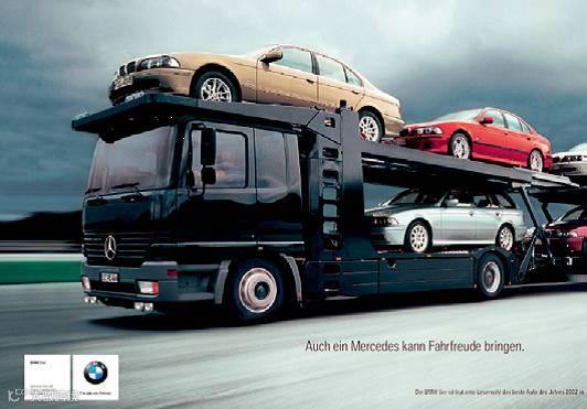 >>宝马的一则竞品广告,上面写着开着奔驰车也挺开心的。而那辆奔驰货车上全是宝马汽车。