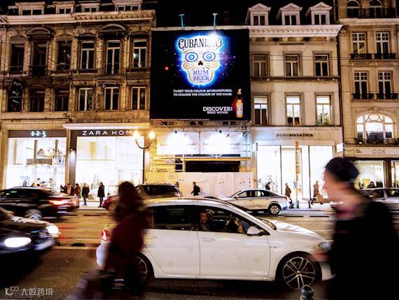 一旦夜幕降临,在比利时主要城市的大街小巷,户外广告牌就会变身为Cubanisto巨幅Logo。然而吸引途经消费者纷纷驻足的不只是炫目的视觉画面,还有联结社交媒体的奇趣互动。用户只需发送相关推特,就能实时改变骷髅标志的颜色。