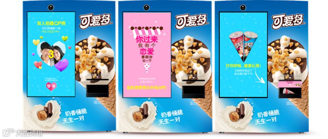 为了将线上的表白热度带到线下,安索帕与可爱多携手推出全国首款冰淇淋自动贩卖机,在北上广等多个城市的约会热地展开巡游。不论是情侣或亲友,只需通过贩卖机上的摄像头拍下亲密合影,输入专属的爱意宣言,可爱多贩卖机就能立刻打印出你的DIY包装贴纸,令可爱多变身独一无二的“表白神器”。