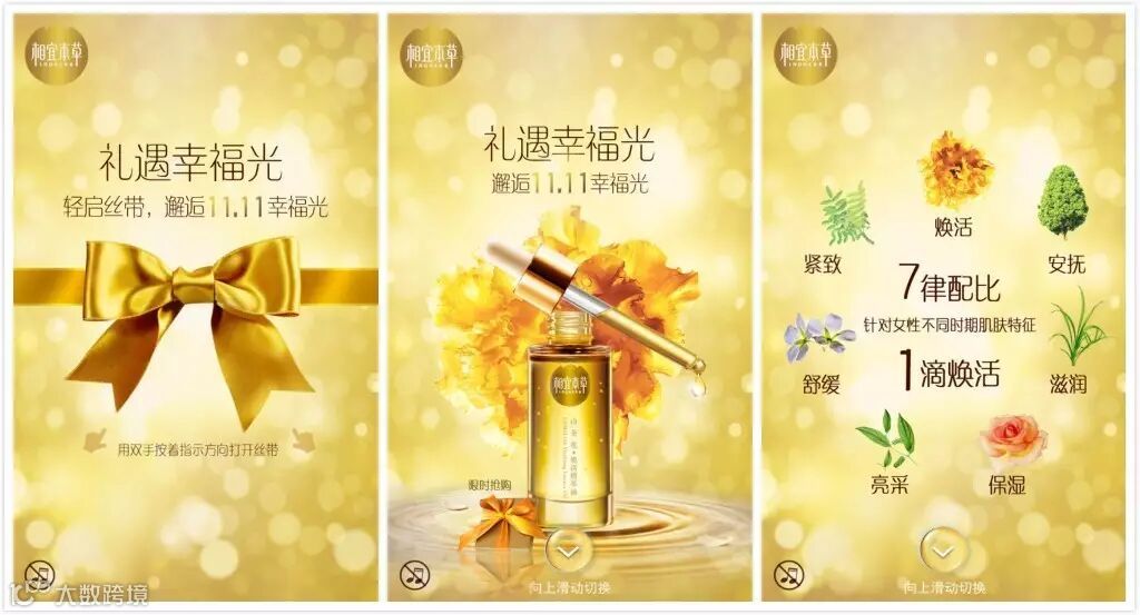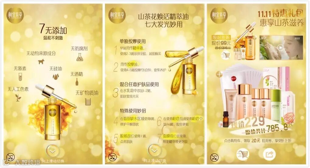 双十一购物攻略H5优雅呈现主打产品“山茶花精油”,并直接引流至电商平台,为双十一活动提前预热,促进销售。