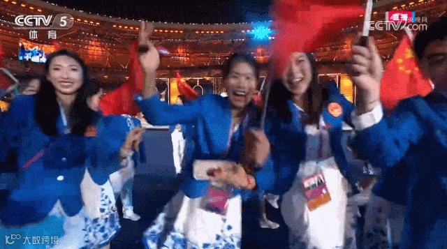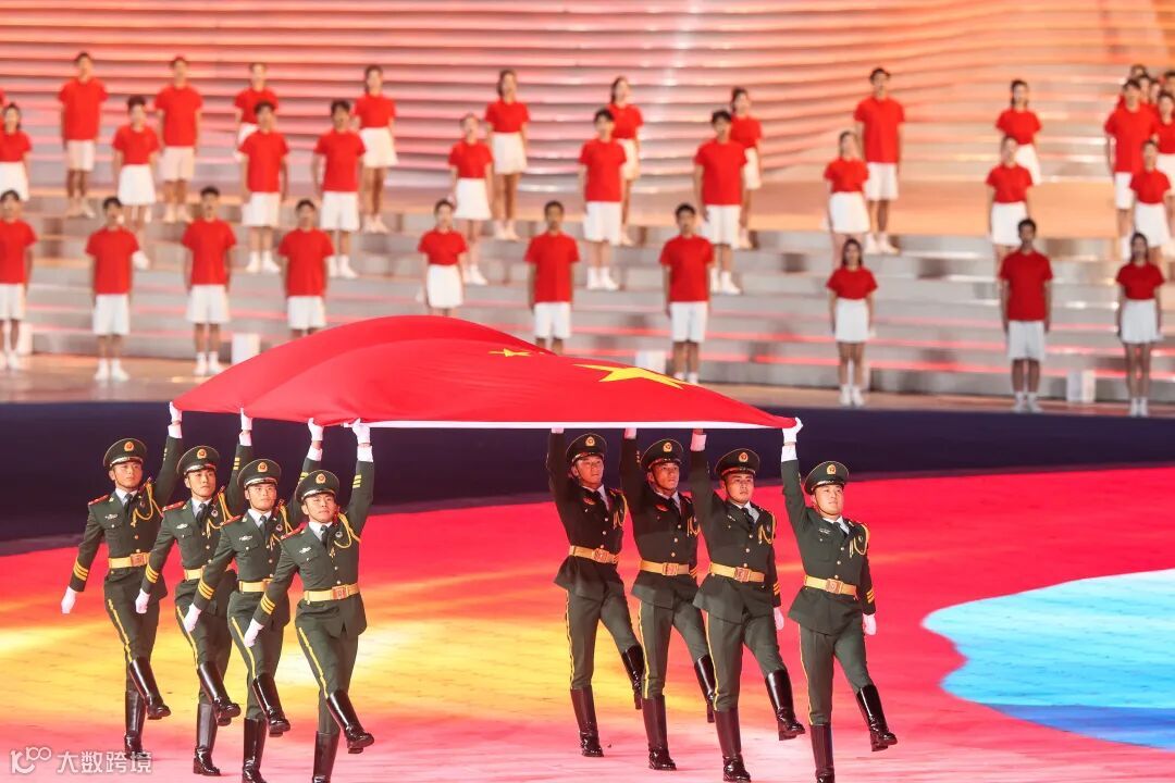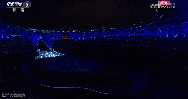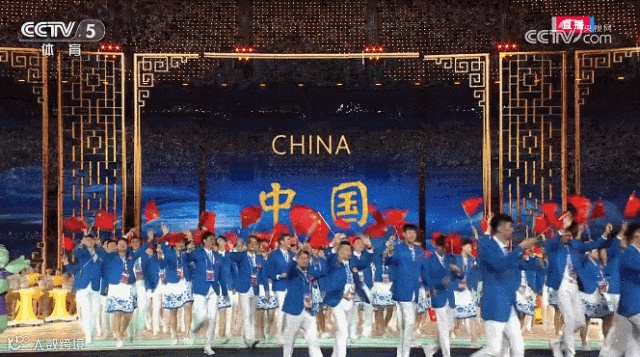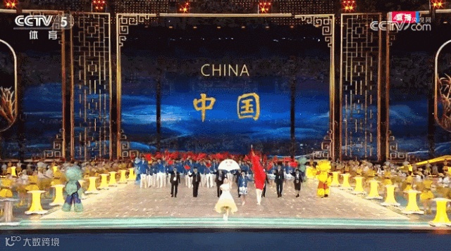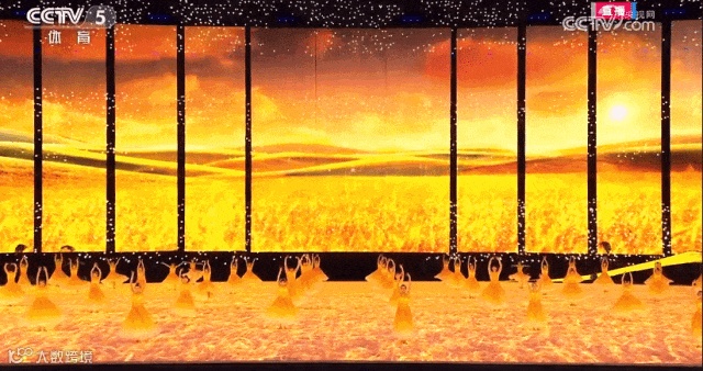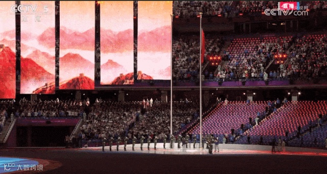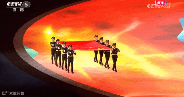 国旗队8人在《我爱你中国》的歌声中入场,整齐划一的步调,彰显着大国的庄严和沉稳。地屏上浮现大好河山的影像,一条红绸飞掠而过。这一抹中国红带着喜悦祥和,带着国人深深的家国之恋、爱国之情,飞入全球华人的心灵。