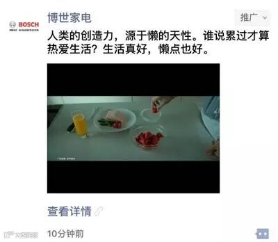 朋友圈信息流广告也同步上线,向更多的“懒人”宣布:未来,你们的“懒”生活被博世承包了。