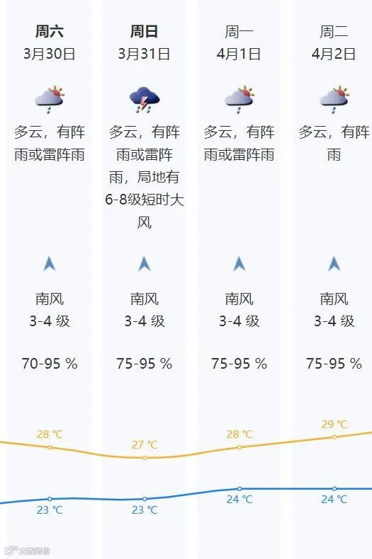 3月31日有雷阵雨,伴有6-8级局地短时大风。