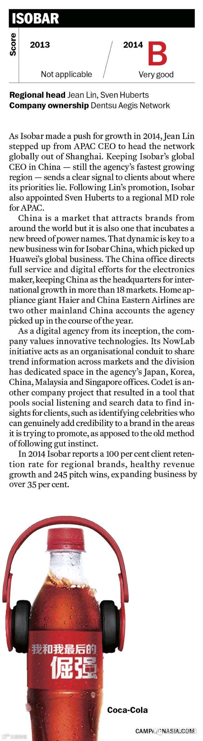 在与AKQA,DigitasLBi,Razorfish 和Wunderman等众多数字代理商的角逐中脱颖而出。此次荣誉是Campaign Asia近年来第一次特别为数字类别代理商发表年度报告。这是继去年年底安索帕亚太区赢得2014年度最佳数字代理公司荣誉之后,近4年中第3次获得业界内的最高荣誉。报告的评语正符合具有创新精神的安索帕文化:“从成立一家数字代理公司开始,就要了解它的价值体现在技术创新。”