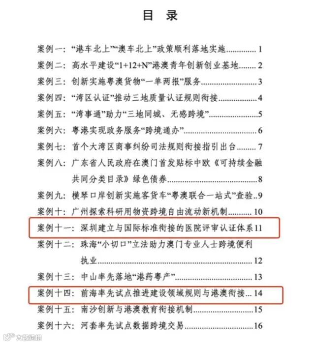 根据发布会,16个案例入选第二批典型案例。其中,“前海率先试点推进建设领域规则与港澳衔接”以及“深圳建立与国际标准衔接的医院评审认证体系”两个案例入选,均与前海关系密切。