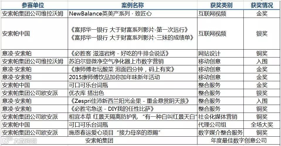 基于集团整体的卓越成绩,安索帕集团还荣获本届金投赏年度最佳数字创意公司大奖。