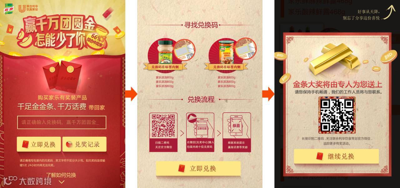 在活动的第一阶段,我们延续去年春节务实、接地气的沟通,以“千万团圆金”邀请厨师群体主动寻找家乐产品包装上的兑换码,通过兑换平台轻松获取手机话费、Q币、金条等诚意好礼,为其创造更多与家人交流的机会,并鼓励用户在朋友圈分享活动信息。