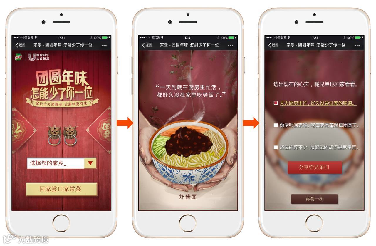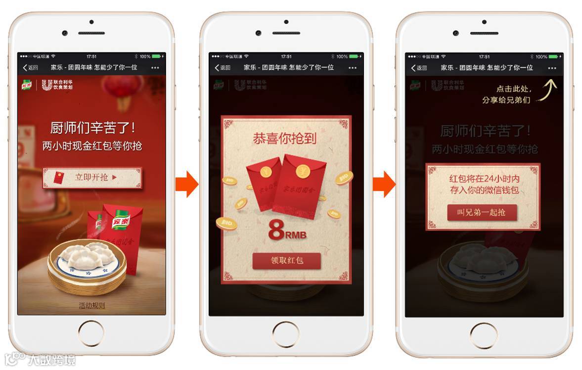 在2015年11月底至12月底产品新装上市期间,春节氛围还不浓厚,借助产品新包装的上市配合社交媒体炒作,大量曝光活动信息,以“千万团圆金”的利好,吸引厨师通过简单的互动步骤完成兑奖并分享给好友。