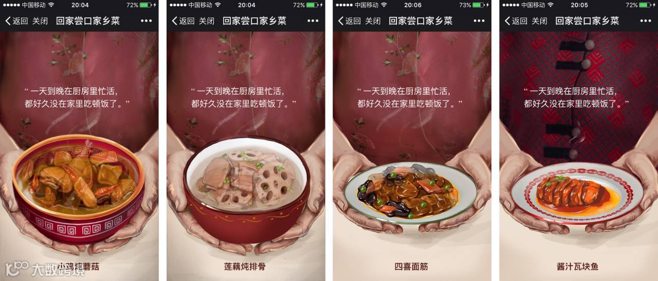 从黑龙江的小鸡炖蘑菇到湖北的莲藕炖排骨,从江苏的四喜面筋到河北的酱汁瓦块鱼……一道道极具地方特色的“家乡味”在动态插画的演绎下,搭配一声声语重心长的家乡话,在引发用户情感共鸣的同时激发其主动分享页面,从而形成二次传播。