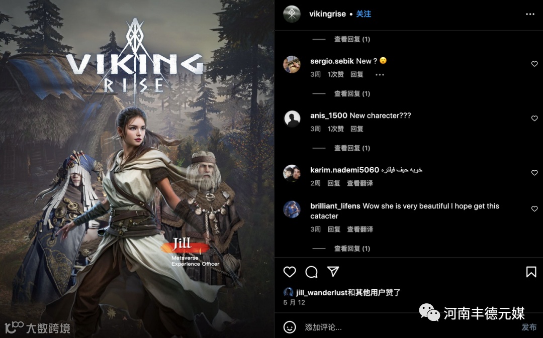 此次Jill以“冒险家”的身份,通过AI技术进入到游戏场景中,帮助品牌将游戏场景具象化,也为玩家带来更有代入感的沉浸式体验:与Jill一起深入维京部落,探索瓦尔哈拉,征服米德加德,在辽阔的北欧大地上,体验征战新大陆(000997)的惊心动魄。通过社交网络互动的形式续写维京文化,提高游戏玩家对《Viking Rise》游戏上线的关注和兴趣。截止6月6日,虚拟人Jill在Instagram及Facebook账号互动达122,000频次,总曝光为1,440,000频次,点赞108,300频次。