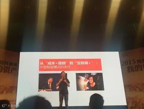给大家讲四个正在发生的变化。第一,从“成本+规模”到“互联网+”。左边的人是张瑞敏,他是1984年的,应该是那代企业家里面进步最高的,四月份的时候他坐在我边上,向总理汇报说,我今年做企业31年,海尔31年来靠什么打天下?两个东西,第一,我有8.2万的产能,是全世界最好的产能,第二,我在全世界有3万家海尔专卖店。在过去两年里面,海尔裁员2.6万人。现在80、90后朋友去哪里买家电?你们去一号店、京东、天猫,所以他说我坚决的变革。上个月我在海尔两天,访问了六个部门。今天的海尔薪资级别只分三级,第一叫平台组,第二叫小微组,第三叫创客。而中国现在制造业分三级公司,一个叫海尔,一个叫小米。