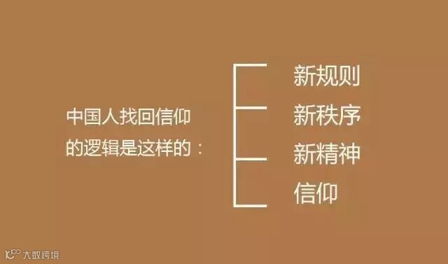 具体来说就是:中国正在建立一套完善而合理的社会秩序,让每个人都能各尽其才,各取所需。在此基础上形成了新秩序,而秩序的运转将产生新的精神,比如契约精神。精神的碰撞激发起内心的向往,一旦我们心有所属,这就是信仰。