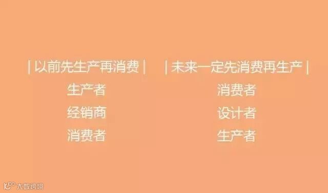 当你有一个想法时,你可以先表达出来,然后在平台上进行展示(这样的平台会越来越多),然后吸引喜欢的人去下单,拿到订单后可以找工厂生产(不用担心量太少,今后的生产一定会精细化和定制化),然后再送到消费者手里。
