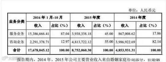 数据显示,2016年1-10月、2015年公司主营业务收入分别为1767.8万元、875万元,其中服务业务收入分别为1538万元、393万元,占比87%、45%。这意味着,仅婚外情矫正业务一项,每月就能为上海维情带来上百万的收入。