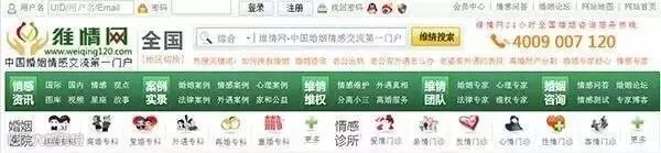 “保家卫婚,就来维情!”系来自维情网官方微博的宣言,而维情网的官方首页将网站称作“中国婚姻情感交流第一门户”。公司主要提供婚姻家庭咨询与服务,80%的服务业务为婚外情矫正。