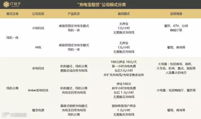 从上面这张表格中,我们可以将这 5 家最近获投的充电宝公司按照“能不能将充电宝带走”分为两类,即“线机一体模式”和“线机分离模式”。