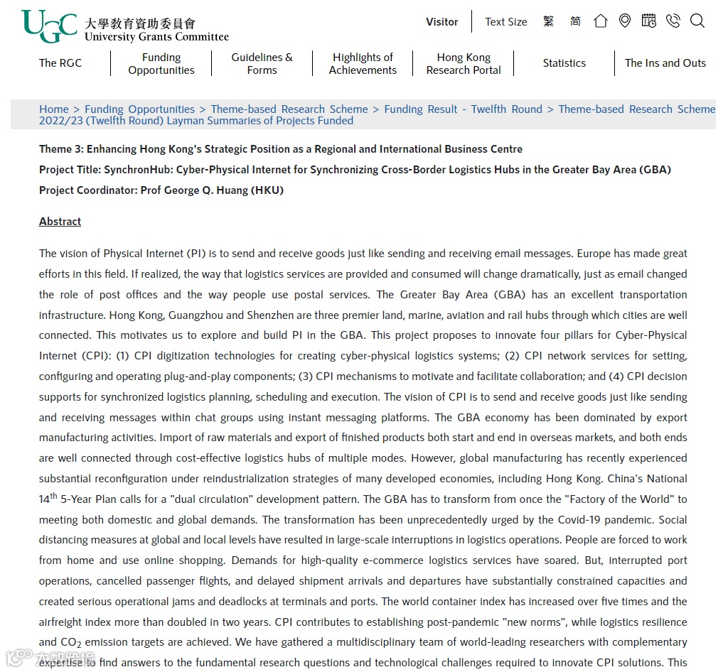 近日,香港大学工业与制造系统工程系主任、香港大学前海智慧交通研究院港大方面负责人黄国全教授担任课题负责人的主题研究方案“大湾区跨境物流枢纽互动智联网研究”入选香港研究资助局“2022/23主题研究方案”资助名单,资助金额4030万元港币。