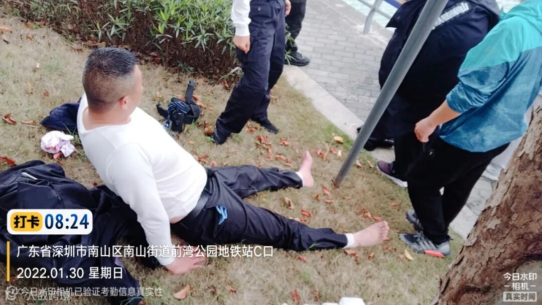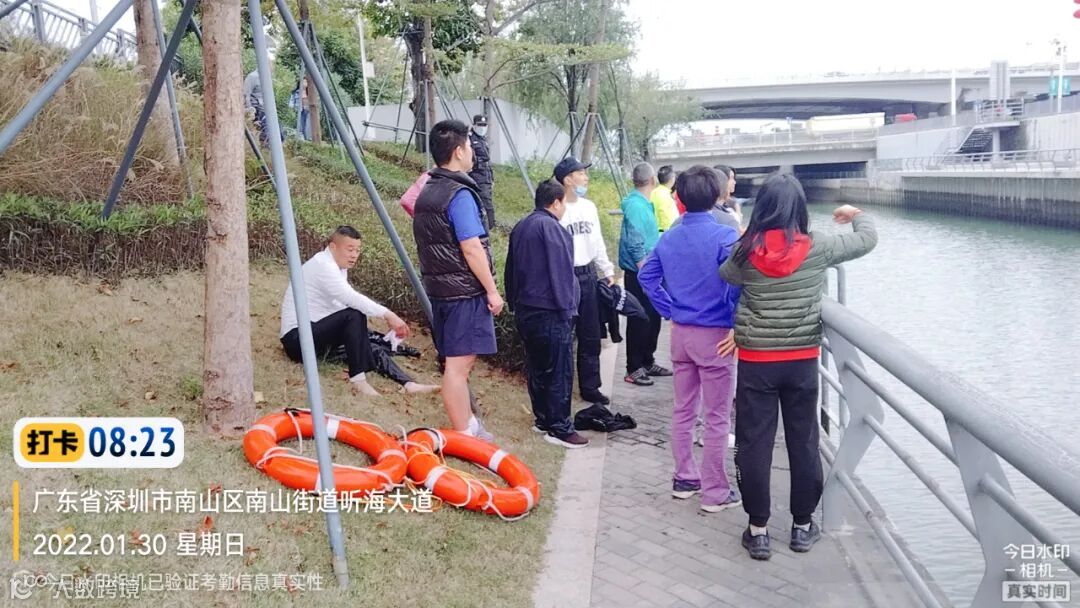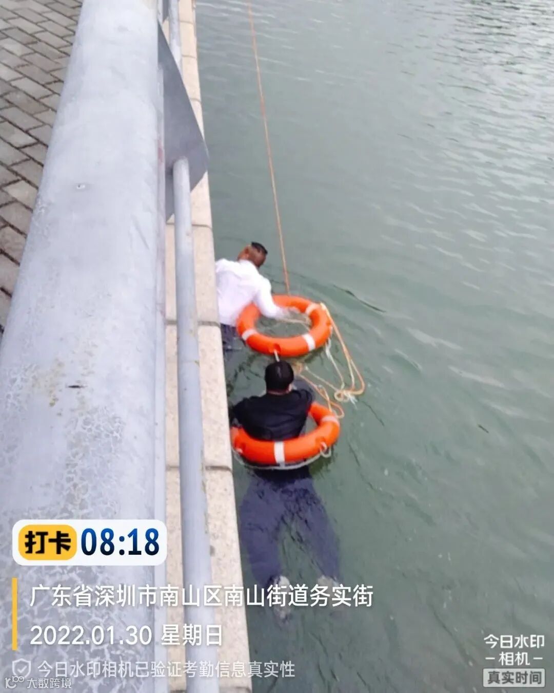 1月30日上午8点10分,一位30多岁的青年从前湾三路桥上一跃而下,跳入河中。路过的市民看到,呼喊着“救人”!“救人”!正在前海运动公园巡逻的前海市政公司安保队员闻讯后迅速到达现场救援,并立即拨打报警电话。