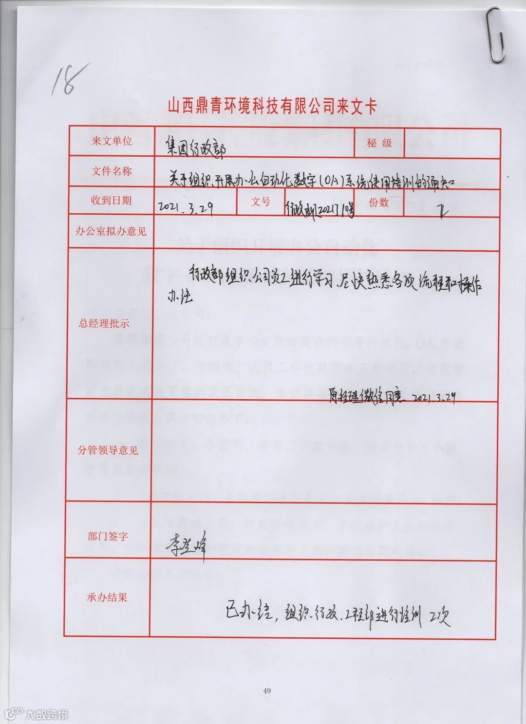 在来文卡中,公司领导会对这一文件进行批示,比如:让某某部门,按文件要求写个报告上交;例会传达等等都要写在上面,承办部门只需要按照文件中领导批示内容执行就好。