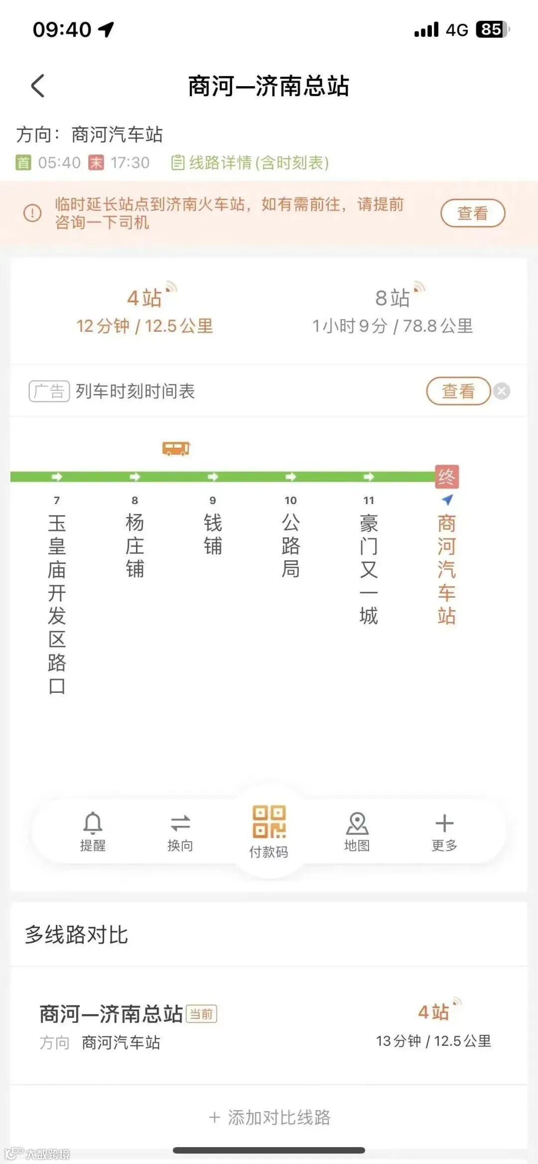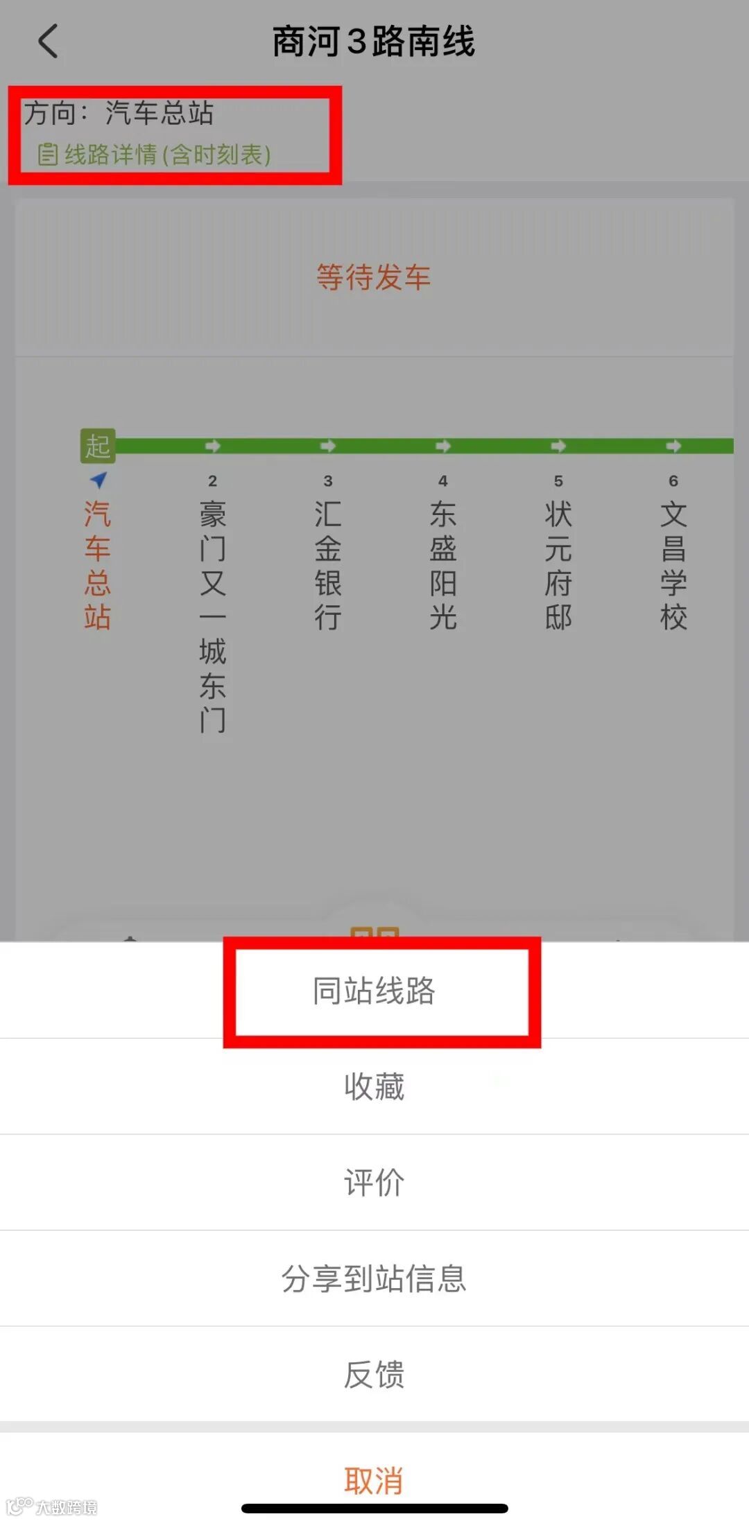 点击“同站线路”按钮,可查看途径该站点的其他线路。点击“时刻表”可查看该线路全天运营时刻表。