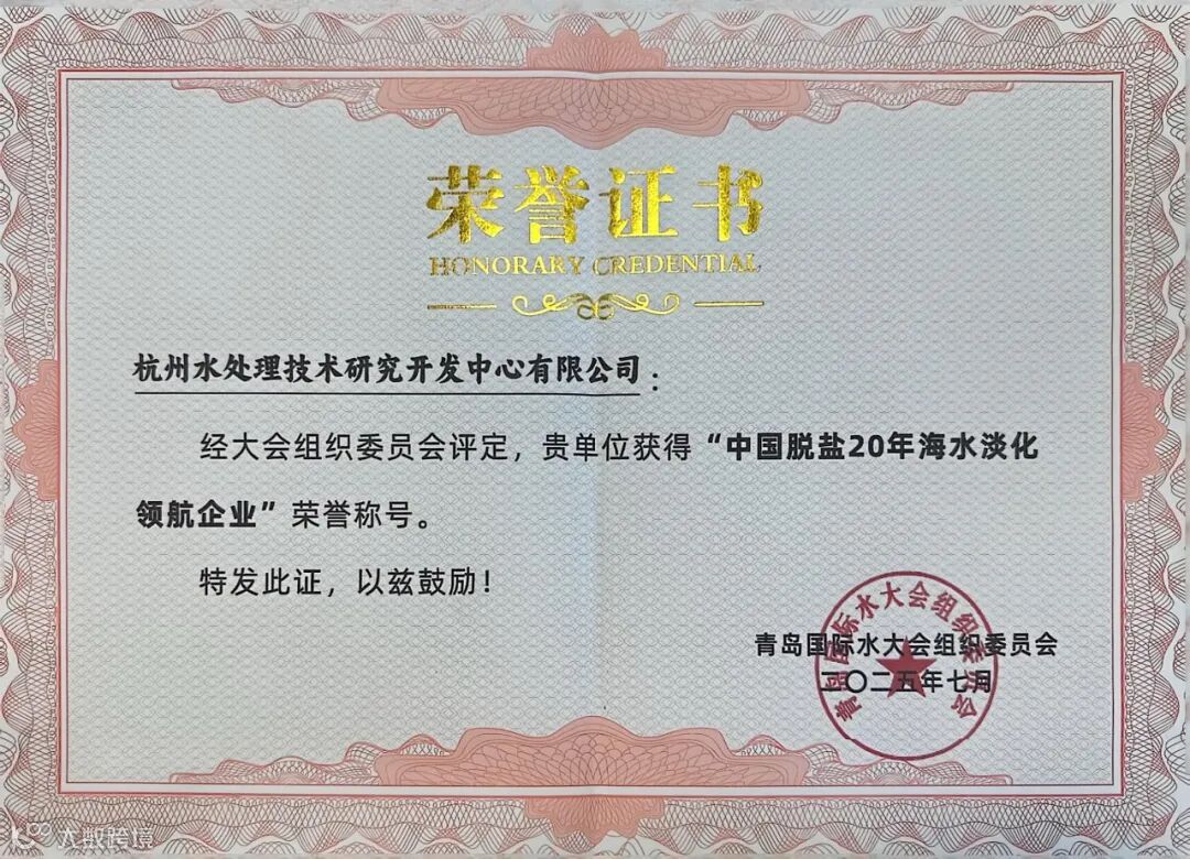 凭借在膜法水处理领域四十余年的持续创新及对中国脱盐行业做出的突出贡献重点企业,杭州水处理荣获“中国脱盐20年海水淡化领航企业”荣誉称号。