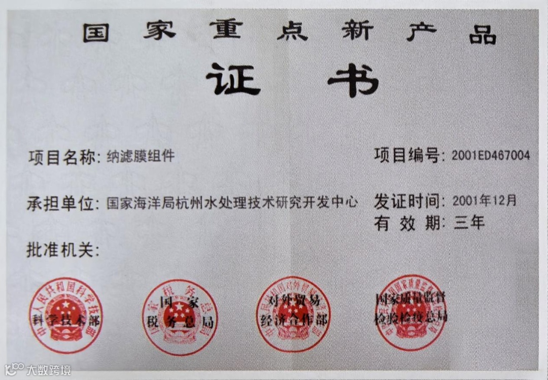 “纳滤膜组件”国家重点新产品证书