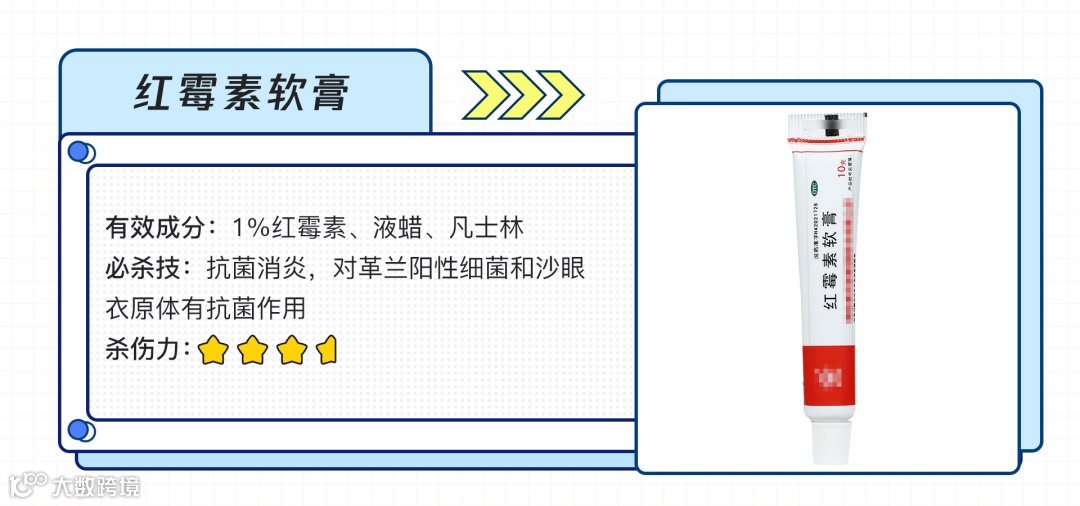 比如身上长了脓包、化脓了;轻微划伤,清洗消毒后;做饭的时候小面积的烧伤、烫伤,先用冷水冲洗一下,都可以涂点红霉素。