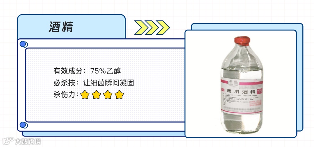 70%~75%(体积比,也就是100毫升酒精中含75毫升的纯酒精)浓度的酒精,医用名乙醇,可以用于手、皮肤、物体表面消毒,能让细菌的蛋白质脱水凝固,失去活性,无法作恶。