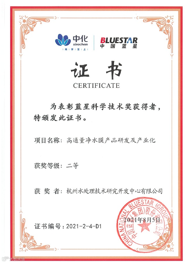 2021年8月5日,高通量净水膜产品研发及产业化项目获得2021年度蓝星科学技术奖二等奖。项目研制的净水膜产品关键性能指标达到国际先进水平,现已申请国家发明专利6件,获得授权1件,极大地提升了公司产品的市场竞争力。