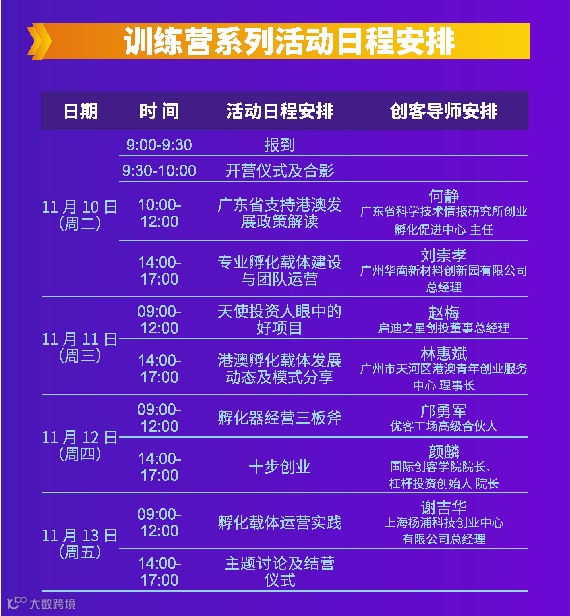 本次训练营活动从11月10日持续到11月13日,吸引了梦工场园区18家孵化载体和科控公司近60余人报名,邀请了多名理论研究功底扎实、实战运营经验丰富的创客导师,从港澳发展政策、专业孵化载体建设及团队运营、港澳孵化载体发展动态及模式、孵化载体运营实践、十步创业法等主题进行分享。