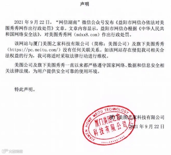 之后,美图秀秀官方发布声明,称与美图秀秀网没有关联。美图公司称,“美图秀秀网”网站与厦门美图之家科技有限公司(简称:美图公司)及旗下美图秀秀(https://pc.meitu.com/)没有任何关联关系。如该网站存在侵犯我司相关合法权益的行为,我司将适时采取法律行动进行维权。