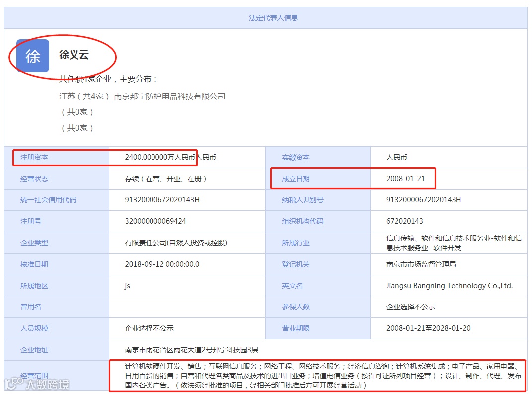 据企盾宝资料显示,“美图秀秀网”域名注册商为江苏邦宁科技有限公司,是一家高科技互联网技术服务提供商,主要从事云计算、域名注册、IDC、VPS、企业邮局、CDN 等业务。公司成立于2008年1月21日,注册资本为2400万元,法人代表为徐义云。