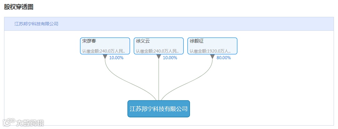 通过企盾宝股权穿透图可以看到,江苏邦宁科技有限公司一共有三大股东,大股东为徐毅征,占股80%,徐义云和宋彦春各占10%。
