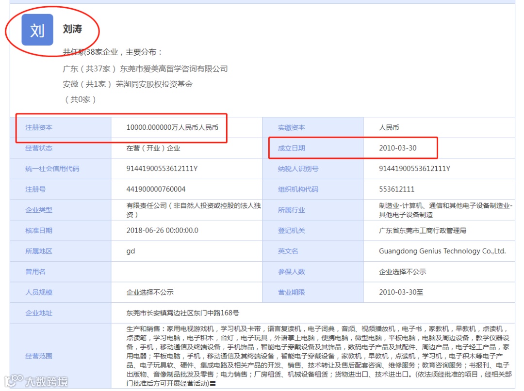 据企盾宝资料显示,广东小天才科技有限公司成立于2010年3月30日,公司法人代表为刘涛,公司注册资本为1亿元人民币,公司主要经营范围是:生产和销售家用电视游戏机,学习机及卡带,语言复读机,电子词典,音频、视频播放机,电子书,家教机,早教机,点读机,点读笔,学习电脑等等。
