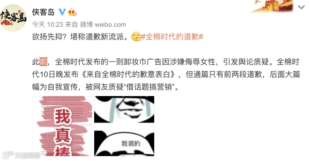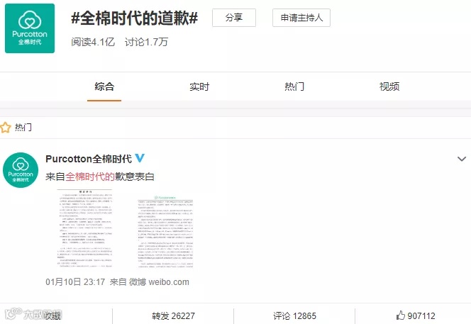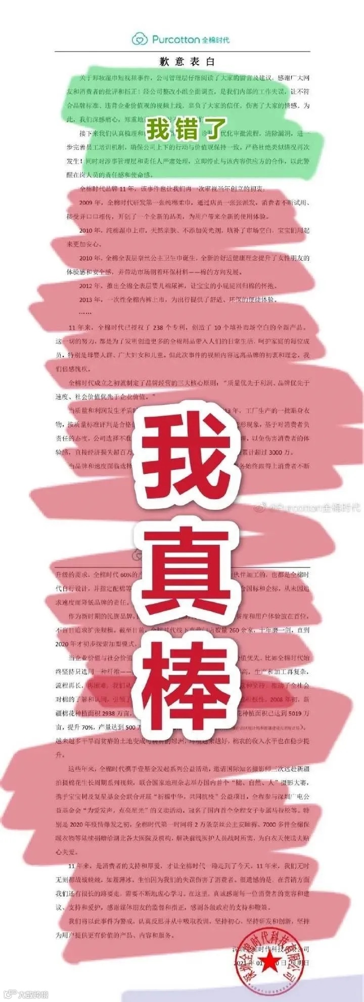 不过,此声明一出,再度引发网络热议,一条#全棉时代的道歉#一度冲上热搜,阅读量达4.1亿。由于在全棉时代的声明中,密密麻麻两页的字,有关道歉的内容却仅有8行,其他大部分均为品牌介绍及自夸,因此不少网友表示对道歉并不买账。难怪微博大V——侠客岛评全棉时代欲扬先抑,堪称道歉新流派。