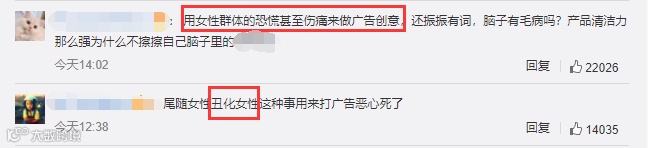 视频一经发出,便受到广大网友的热评,可谓被骂出了圈。有网友分析,这则广告看似宣传产品,实则内涵了两个刻板印象:其一内涵美女都是化妆化出来的,卸妆前后差异大;其二内涵女生被骚扰是因为她自己打扮得花枝招展。