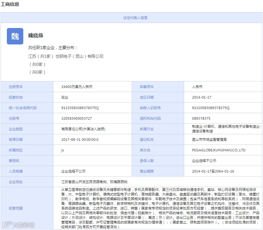 企盾宝资料显示,昆山世硕又名世硕电子科技(昆山)有限公司,其母公司为华硕电脑股份有限公司拆分出来的和硕联合科技股份有限公司,和硕科技专注于笔记本电脑、平板电脑、手机等高科技电子硬件产品的生产组装,为全球五大笔记本电脑生产企业之一。主要客户包括苹果、惠普、戴尔等科技巨头,2019年营收高达3000亿元(442亿美元),是世界500强企业之一。