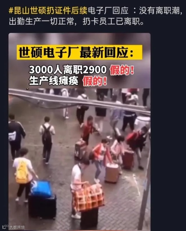 在9月7日下午,世硕电子法务经理陈经理接受采访时表示,目前乱扔证件的两名员工已经离职,其中一位是于上周六自动离职,另外一位按照正常流程已于今日离职。而所谓员工离职潮属于不实消息,目前企业的出勤和生产一切正常。另外陈经理表示,当天在场共有近800名员工,因为环境受限,视频中的两位员工是被叫去临时帮忙发识别卡,目前近800名员工也没有离职,仍在企业正常工作。
