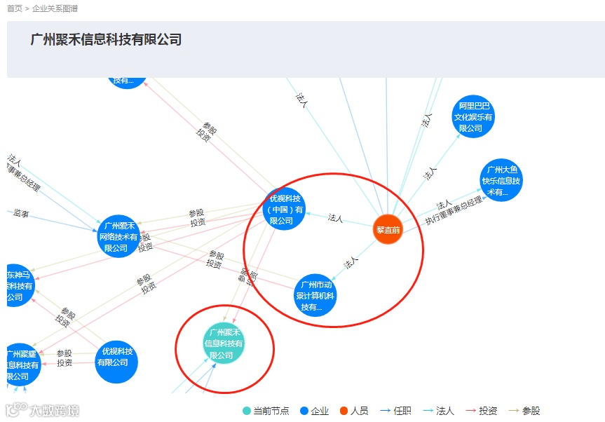 据了解,UC浏览器的实体公司为广州市动景计算机科技有限公司,通过企盾宝的企业图谱与关系探寻功能,可以看到广州聚禾信息科技有限公司就是UC集团旗下的关联公司。