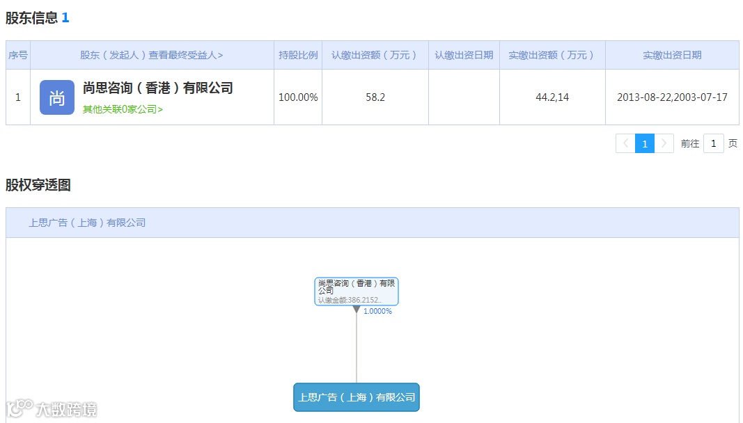 此外,通过企盾宝的股权穿透功能,可以发现目前上思广告(上海)有限公司是由一家香港公司——尚思咨询(香港)有限公司全资持股的。