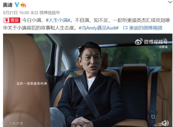 目前,北大满哥发声的这条视频获得逾6万点赞,原始视频也获超10万点赞。相比平时而言,两条视频的曝光量已属高位。但与奥迪广告的传播效果相比还是有一定差距。截至下架前,争议视频在抖音平台上获得近400万点赞。该视频中,刘德华同样以口述的方式讲述了“一直在追求但并不要求完美”的人生态度,并在结尾念出了同样的诗。