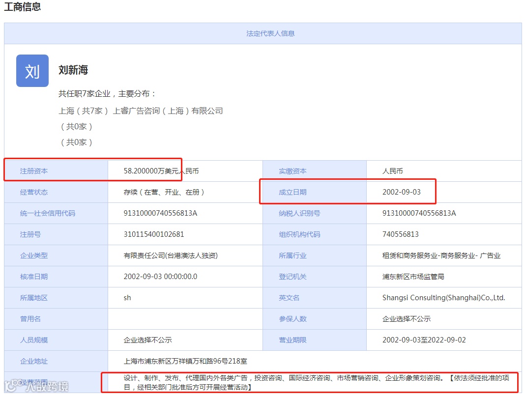 据企盾宝资料显示,上思广告(上海)有限公司成立于2002年9月3日,公司注册资本为58.2万美元,企业法定代表人为刘新海,公司经营范围主要是广告及企业形象策划咨询等。其前身可以追溯到上世纪70年代成立的“萨奇兄弟(Saatchi & Saatchi)”。2013年,M&C Saatchi宣布与本土创意公司aeiou合并,成立全新的合资公司M&C Saatchi aeiou,沿用中文名“上思广告”。但上思在中国市场一直处于默默无名,奋力挣扎的情况。