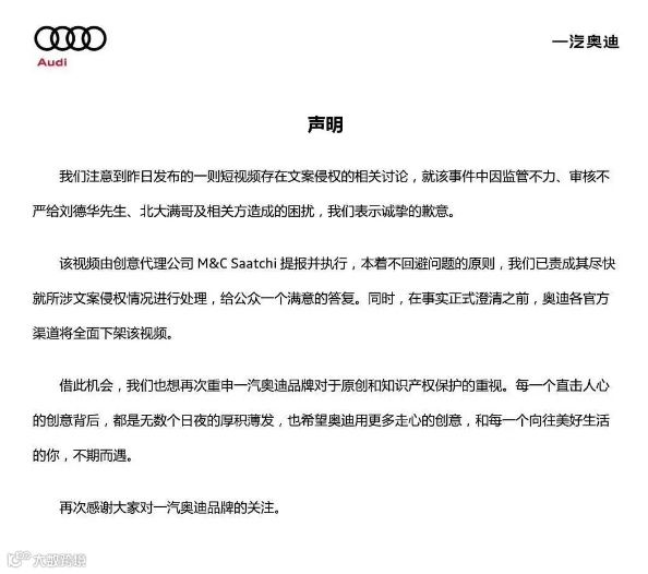 抄袭事件发酵后,奥迪官方于次日发布道歉声明,并下架相关视频。随后,刘德华道歉,并将自己抖音中的该段广告视频删除。