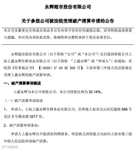 上蔬永辉不仅仅是打着永辉的旗号,它是实实在在的永辉超市参股的企业。但是日前,永辉超市股份有限公司(以下简称:永辉超市)发布公告称,上海市第三中级人民法院裁定受理其参股公司上海上蔬永辉生鲜食品的破产清算申请。