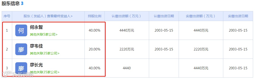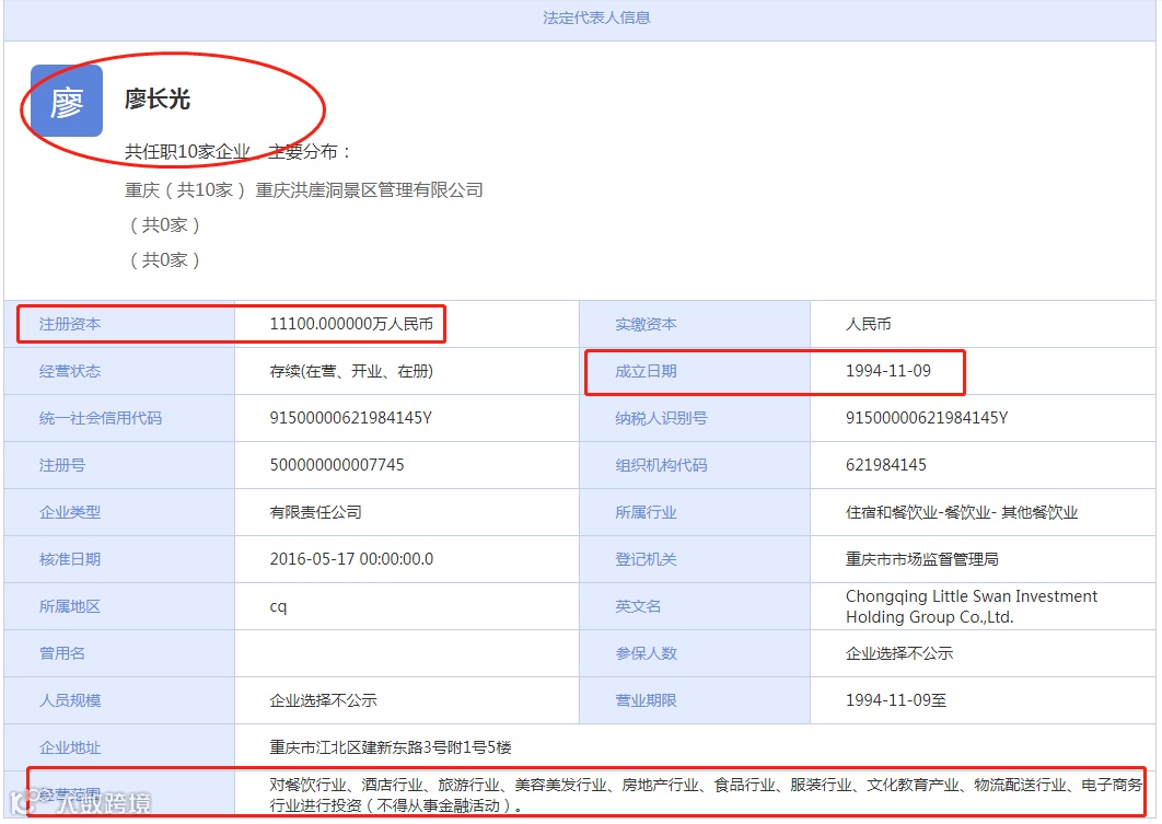 据企盾宝资料显示,小天鹅集团全称为重庆小天鹅投资控股(集团)有限公司,公司法人代表为廖长光,公司成立于1994年11月9日,注册资本为1.11亿元。公司一共有3大股东,其中公司创始人何永智占股40%,法人代表廖长光占股20%,公司董事廖韦佳占股20%。