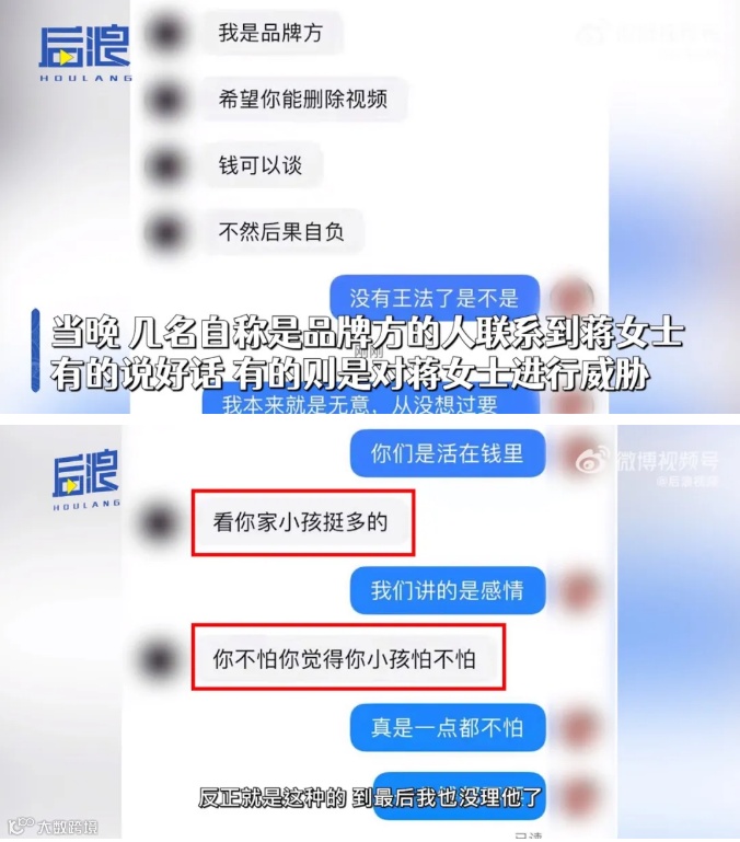 由于视频内容在网上热度越来越高,就在视频发布当晚,有几名自称是品牌方的人联系到该消费者。但是品牌方说的话不但没有悔意,甚至还威胁了她,称“希望她可以删除视频,钱可以谈,不然后果自负”。见到消费者不为所动,员工又放出了更狠的话:看你家小孩挺多的,你不怕你觉得小孩子怕不怕。这其中的威胁意味不言而喻,都说“祸不及家人”,这所谓的品牌方甚至想用小孩来威逼消费者删除视频。