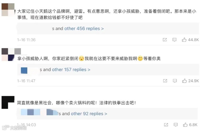 随后,该事件在网上引发热议,网友们纷纷对小天鹅火锅底料生产商及品牌方表示了强烈的谴责。