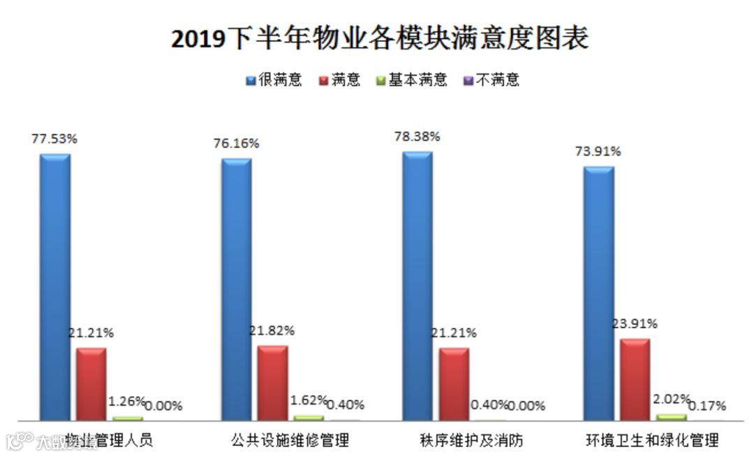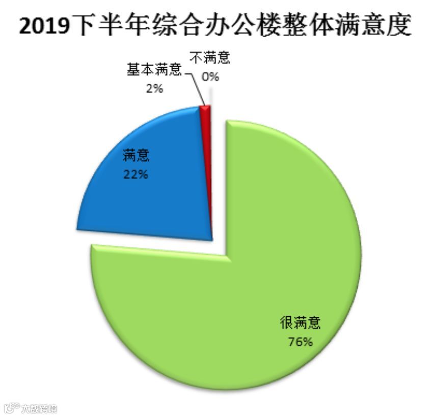 为不断提升服务质量,近日联合物业综合项目对所服务的管理局综合办公楼十二个处室及局属公司工作人员进行满意度调查。调查采取不记名纸质问卷的形式,发放调查问卷共计110份,回收有效问卷99份,回收率为90%。根据调查结果统计,综合办公楼2019下半年度整体满意程度达到98.48%,呈现较高满意度水平,客户对物业服务的总体评价较好。